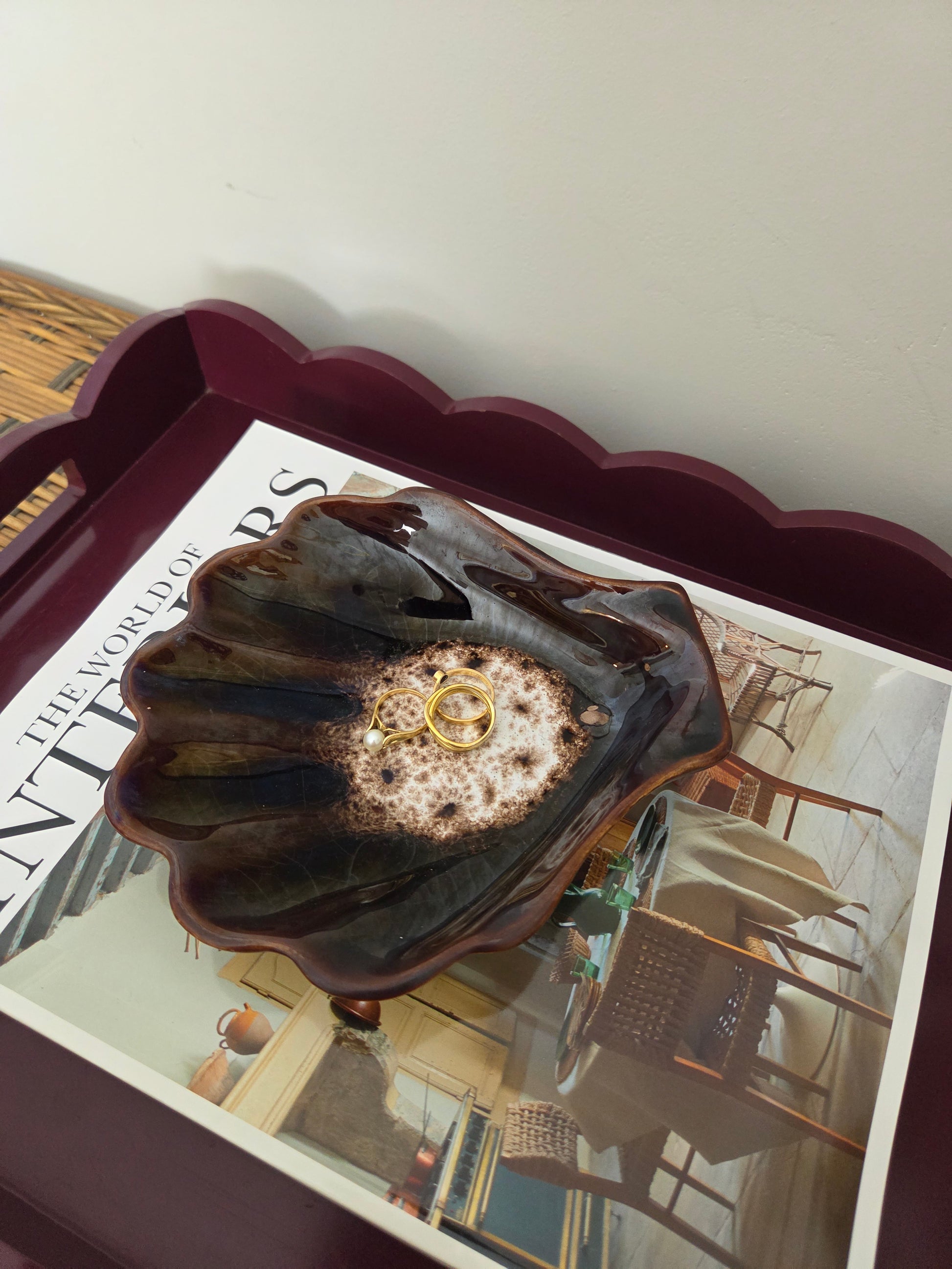 Two beautifully textured shell dishes. Would look beautiful as ornaments on a shelf, used as trinket dishes, or for olives and nuts when friends visit.