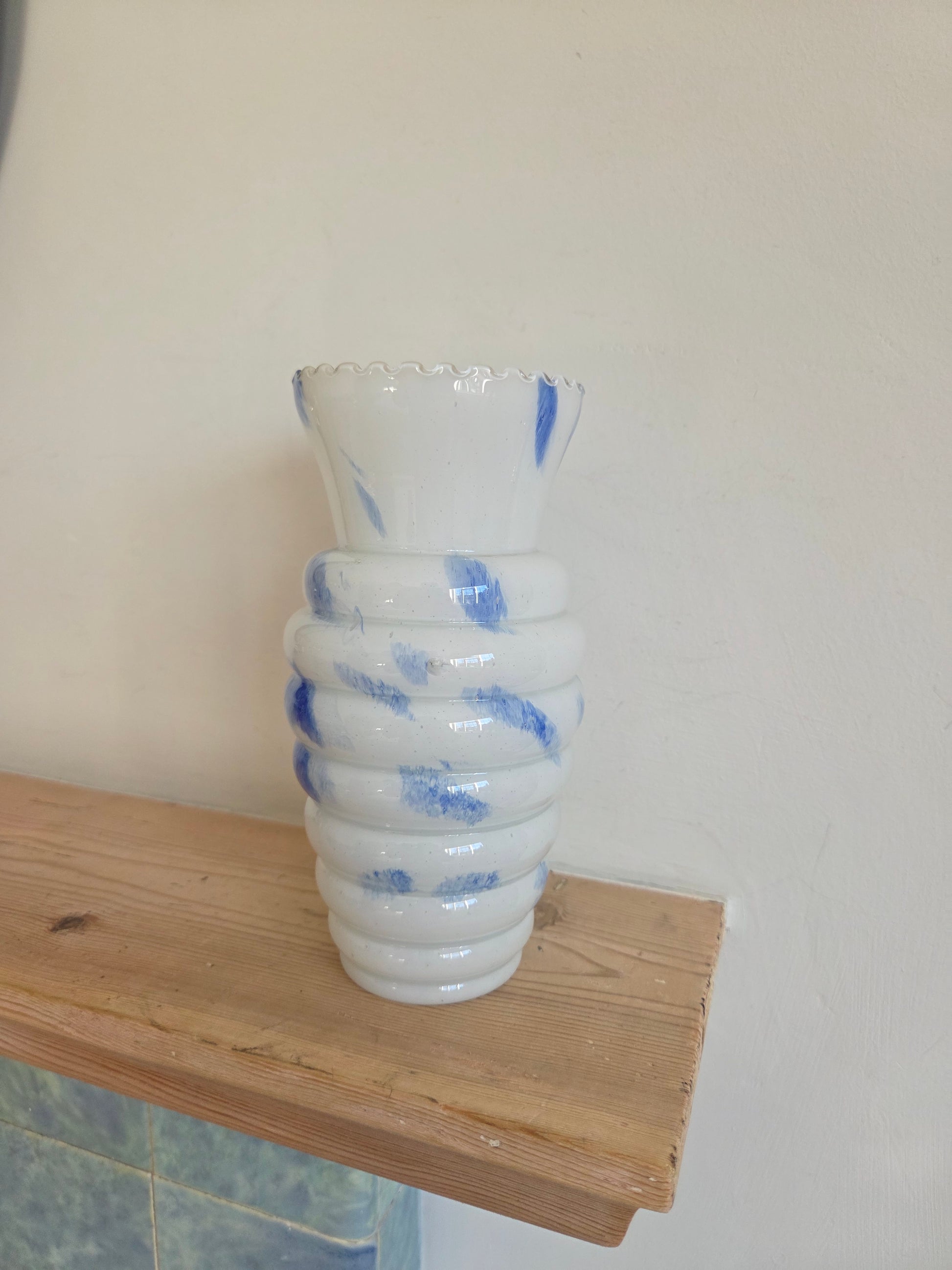 This vintage Art Deco speckle glass vase, likely dating from the 1930s, is such a unique find. I love the painterly splashes of blue in the glass and the frilly, wavy edge at the top. The ribbed, curved design of the body is beautiful and it is the perfect size for a spring or summer posy of flowers.