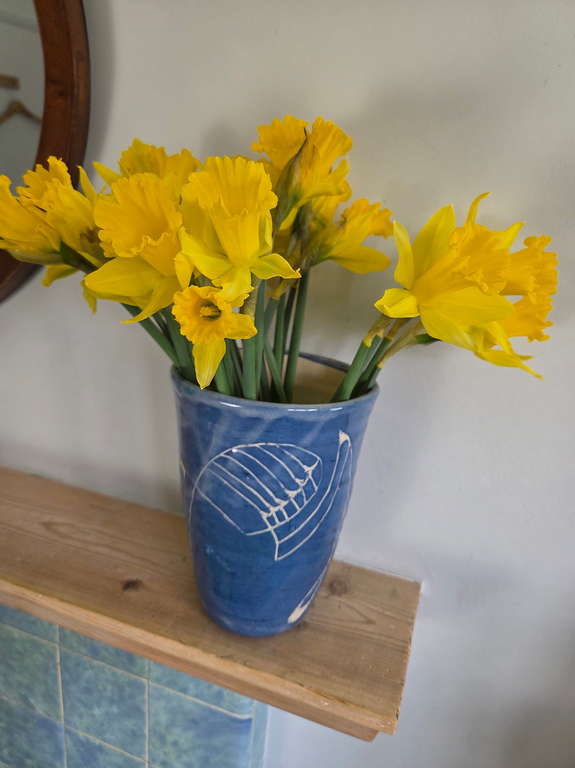 This vintage blue studio pottery vase features a cool white pattern in the glaze. A great piece to add a pop of colour to a shelf or tablescape. Ideal for vintage ceramic collectors.