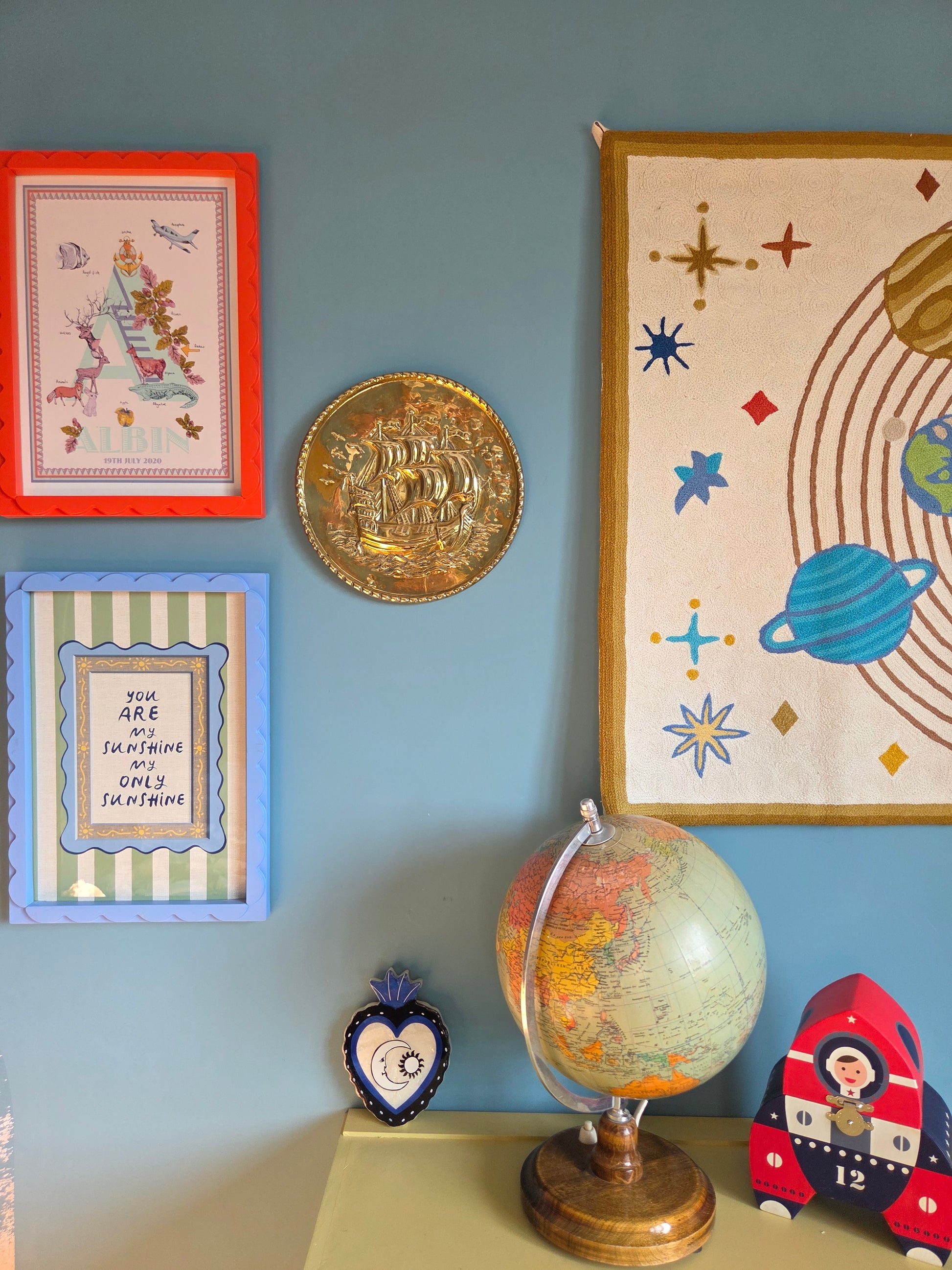 This vintage brass ship wall plate is a great piece for a nautical-themed room - maybe a child's bedroom or playroom. I love the embossed detail and patina.