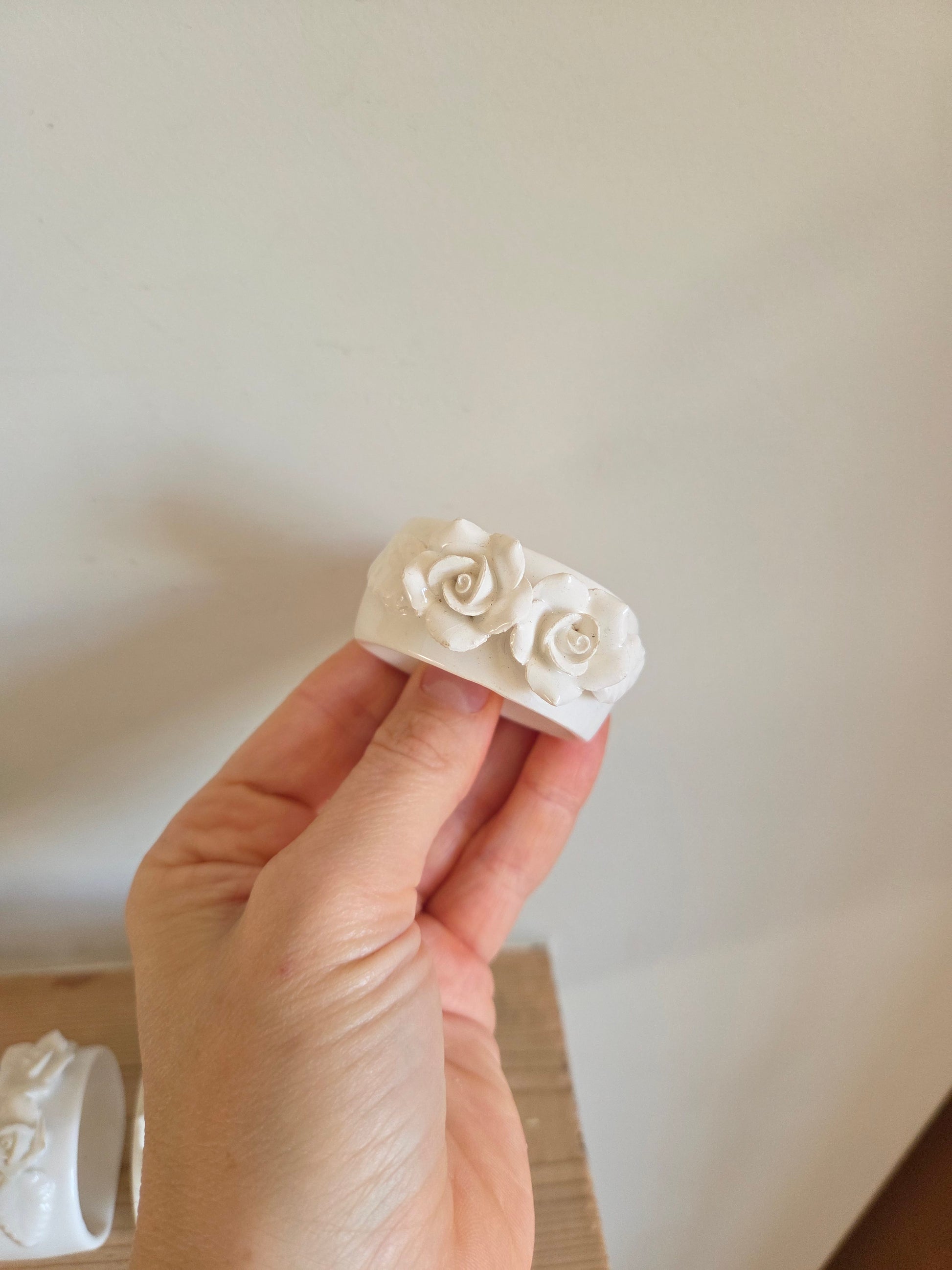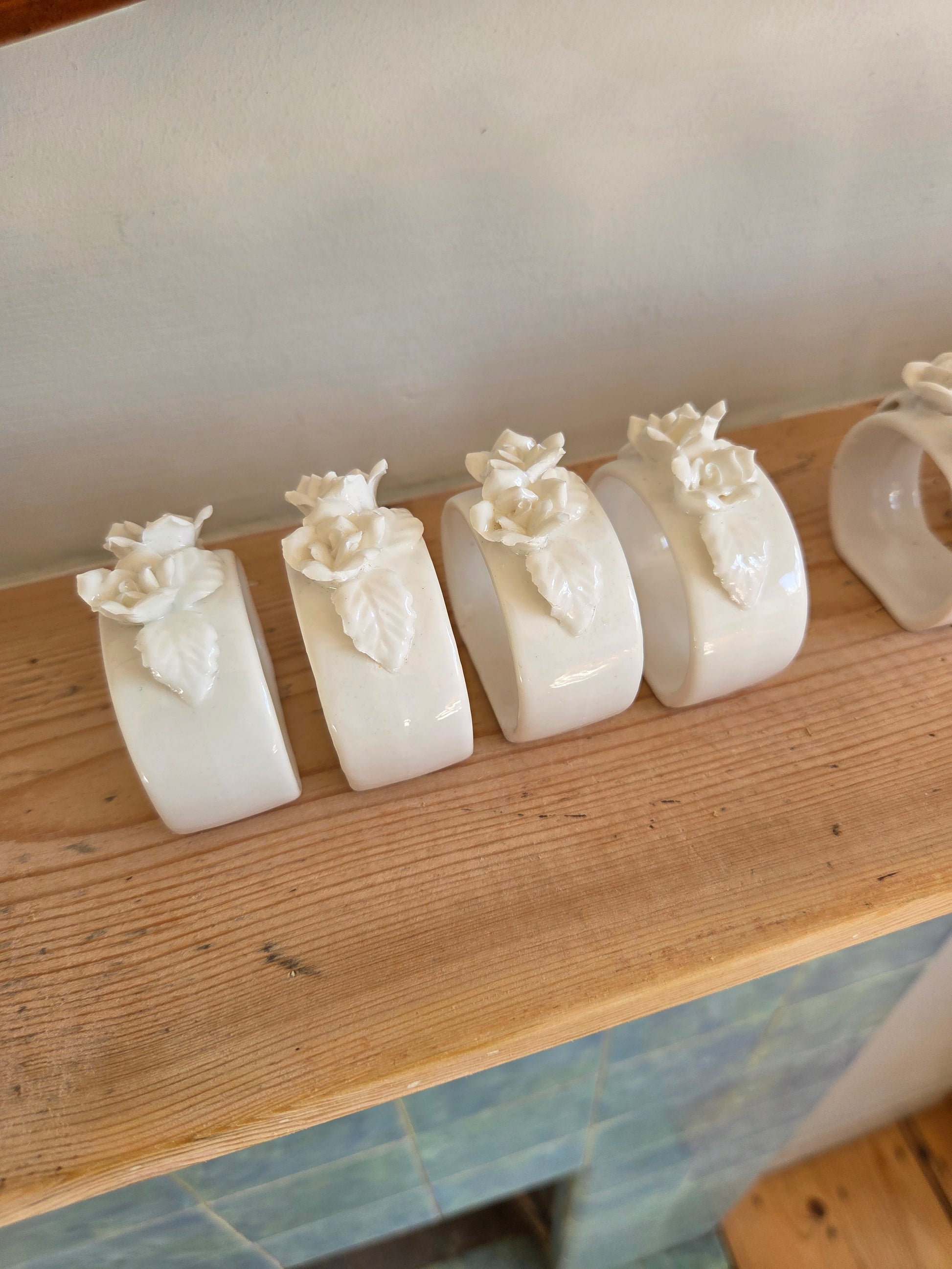 Dainty ceramic napkin rings with flower detail. There are 12 available in total. Price is for a set of 2. If you would like all 12 napkin rings, please purchase 6 x sets of 2.