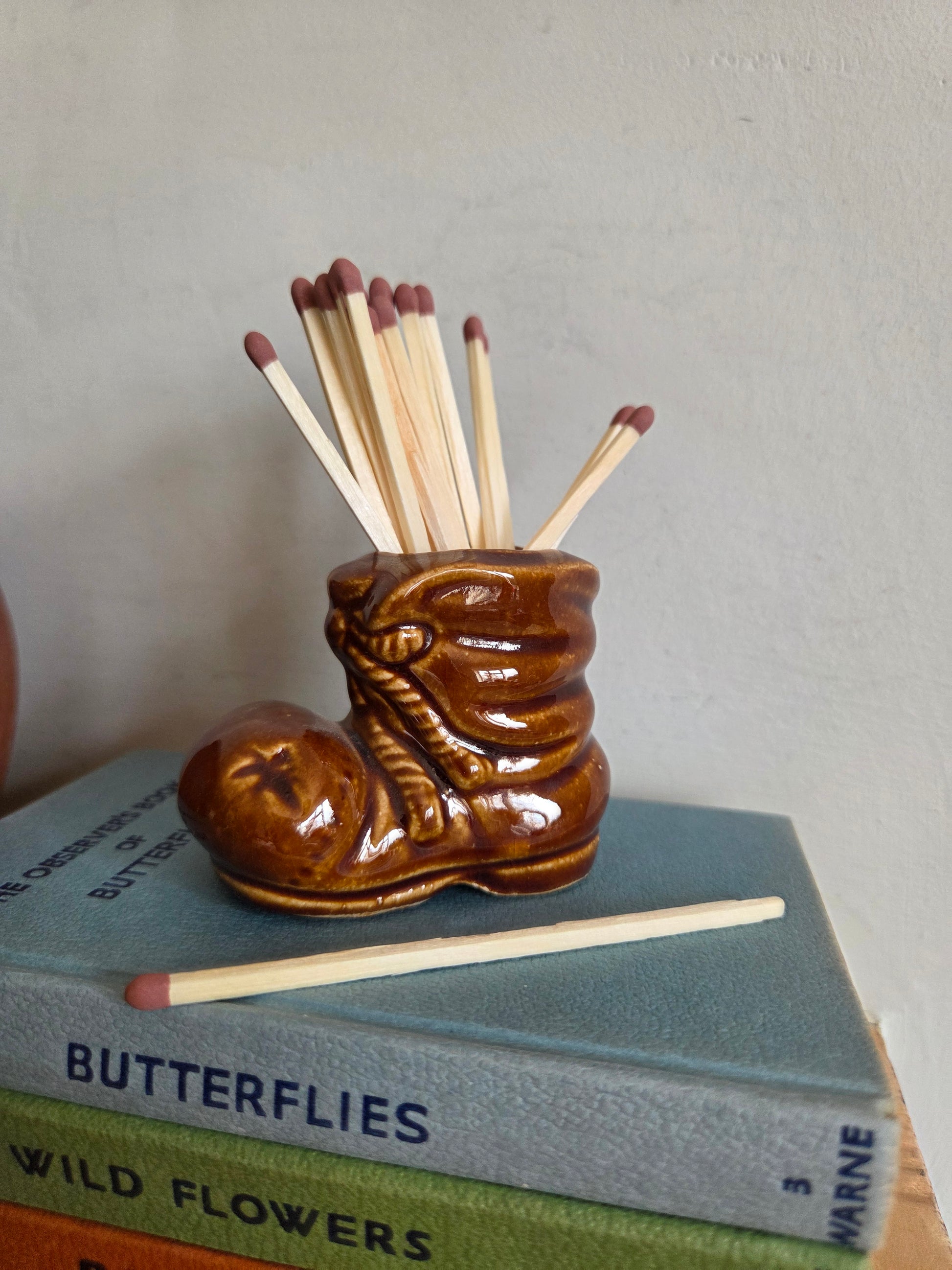 This charming vintage ceramic match boot is a perfectly playful piece of decor. Both fun and functional, I see it taking pride of place on a mantlepiece above a fireplace It would make a unique gift for collectors of vintage ceramics and is supplied with a box of matches and a match strike sticker to add to the base of the boot.
