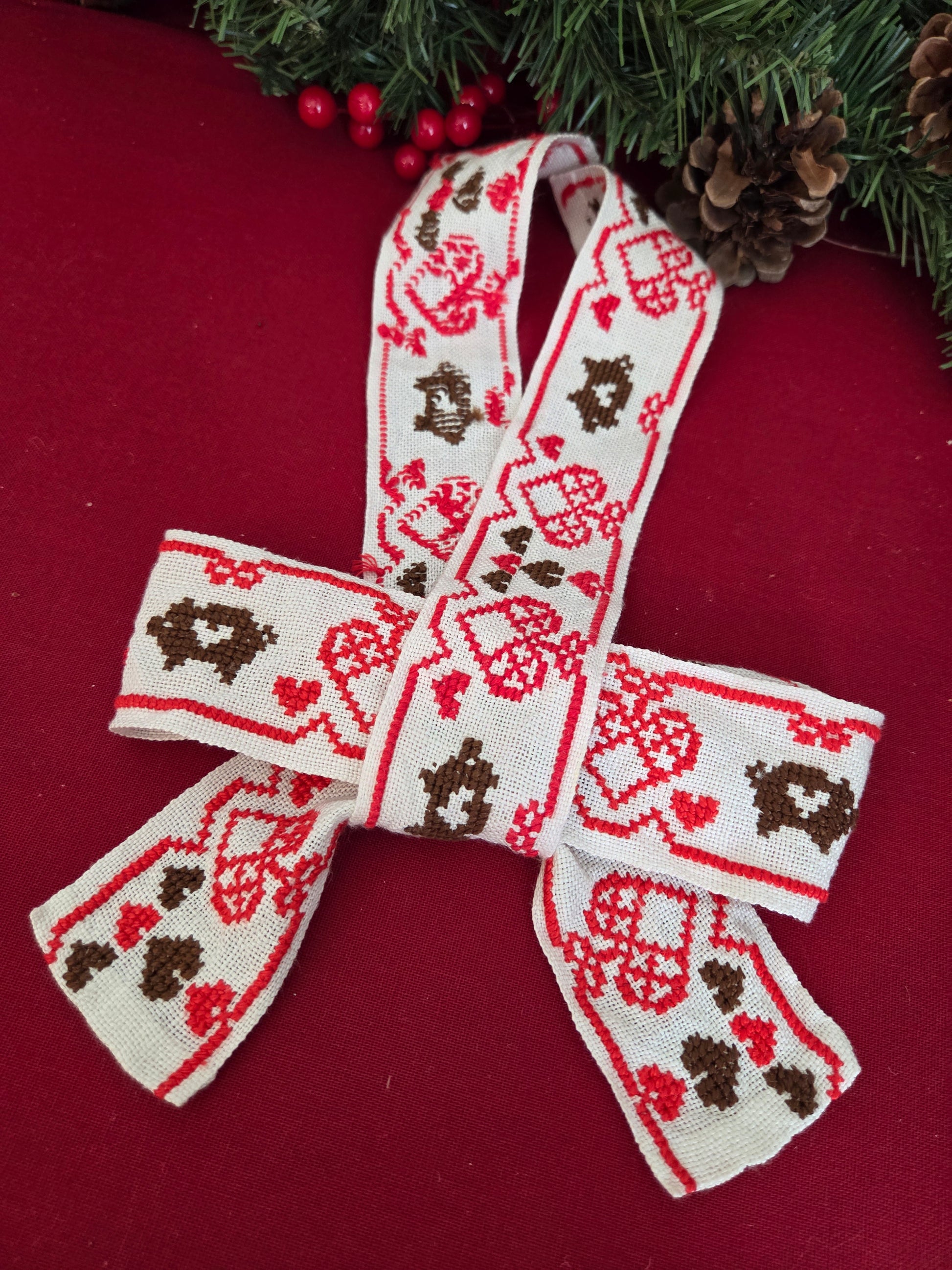 A beautiful hand embroidered ribbon in three lengths. Would look beautiful tied around a gift, around branches on a Christmas tree or hung as bunting.