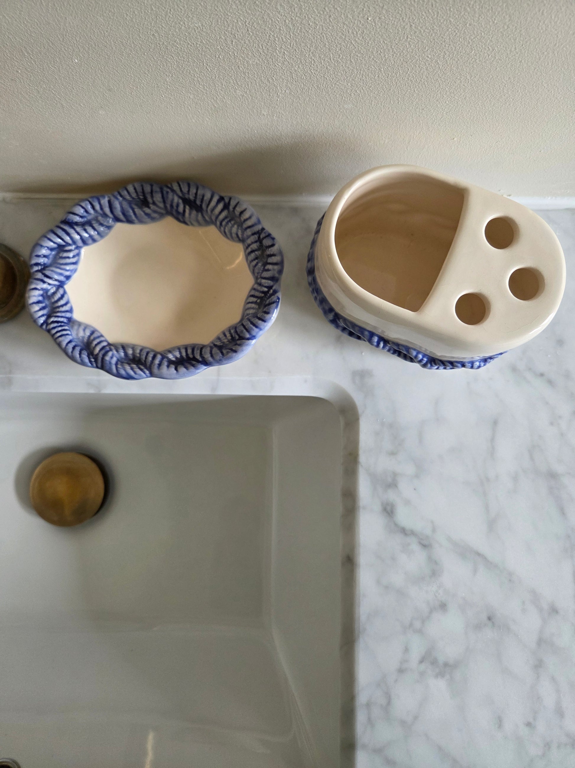 This vintage Portuguese Majolica toothbrush holder is a perfect bathroom accessory. I love the rope detail and pop of blue. I also have the matching toothbrush holder available.