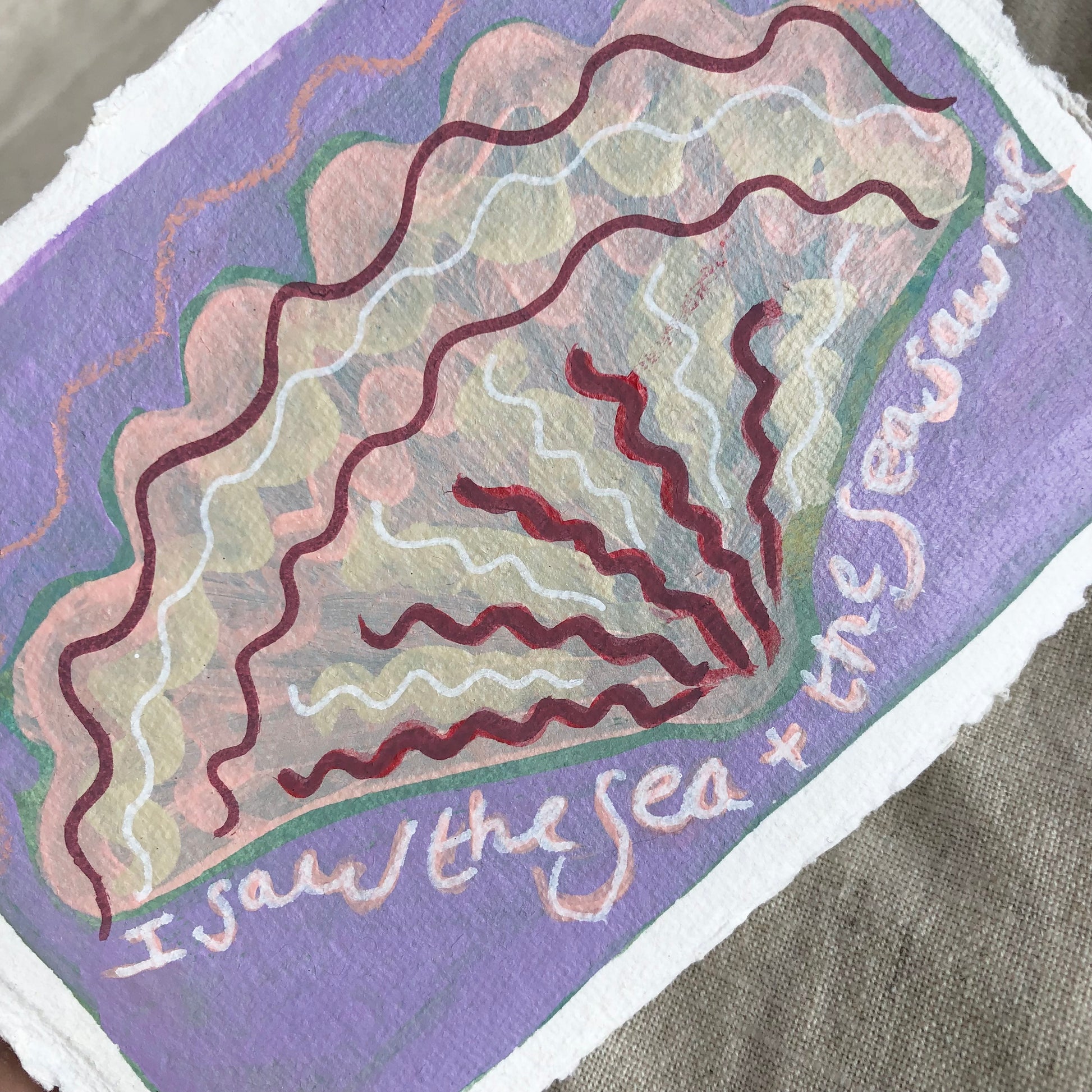 Acrylic paint and wax crayon on handmade cotton Khadi paper featuring a deckled edge.