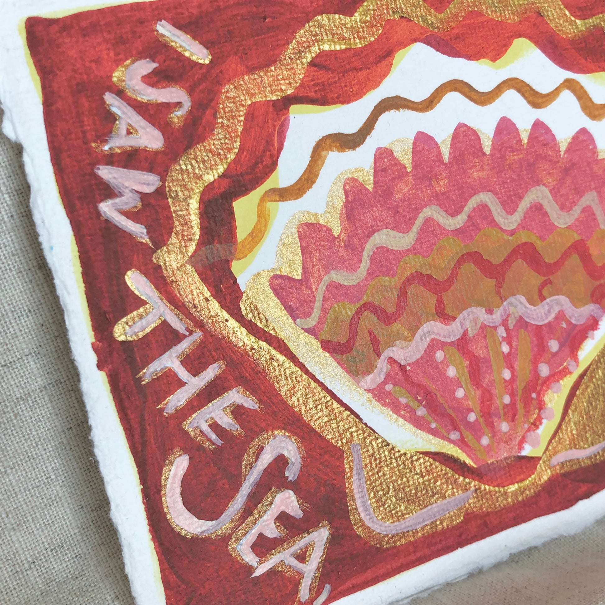 Acrylic paint and wax crayon on handmade cotton Khadi paper featuring a deckled edge.