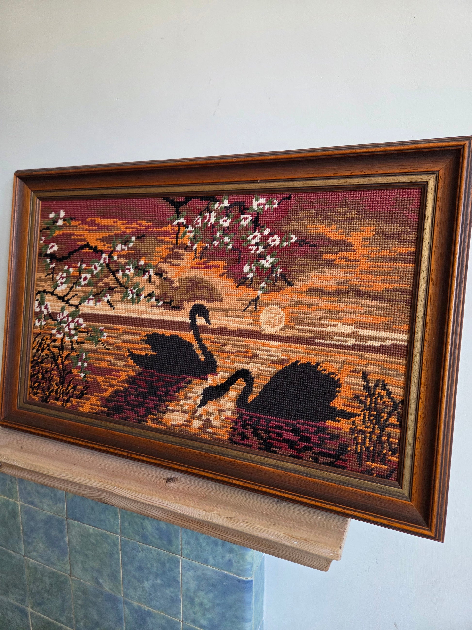 This vintage swan silhouette tapestry is a striking piece of wall decor. Great for fans of vintage textiles and wall art.
