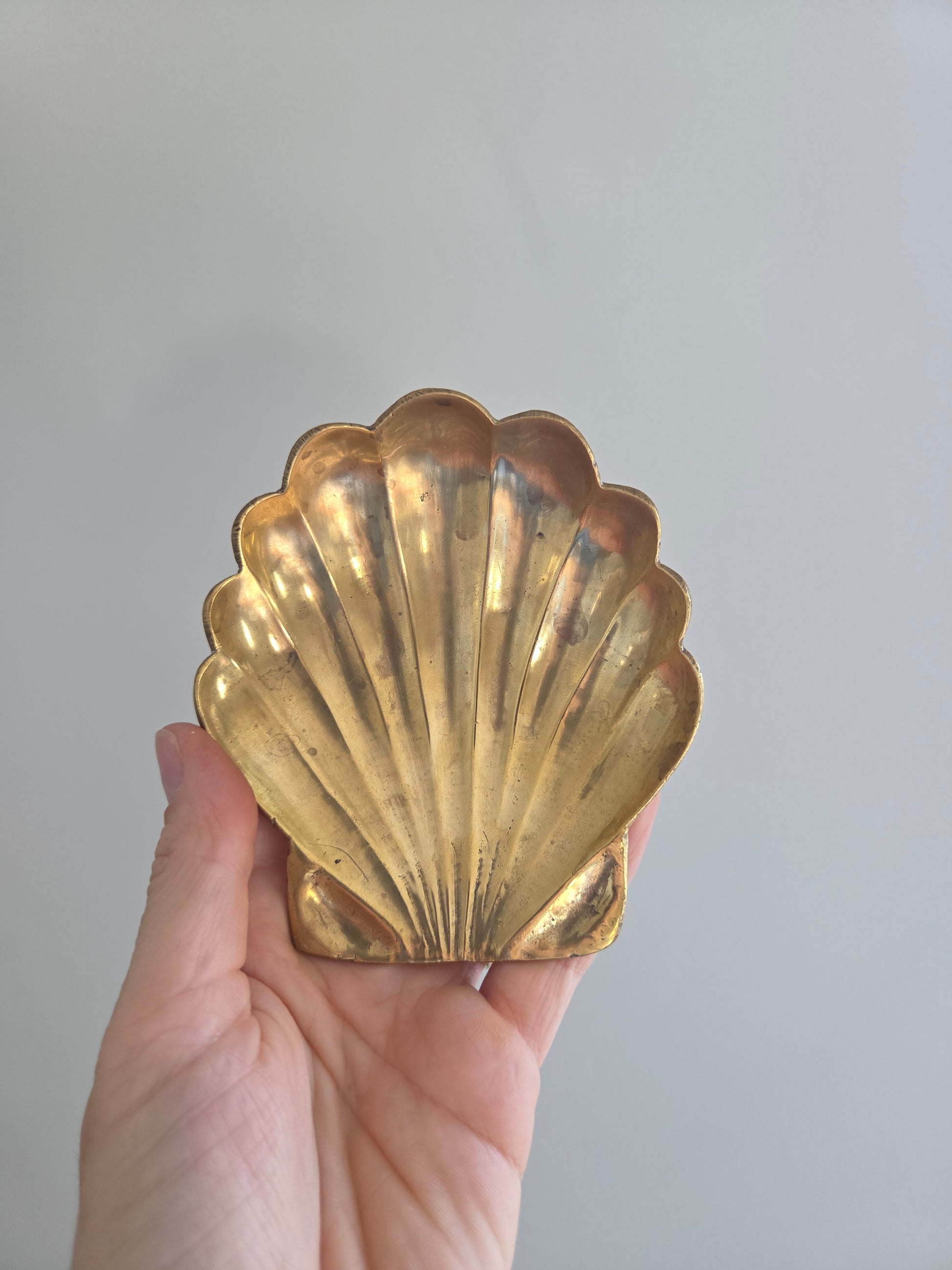 A cool brass trinket dish which has had a plate hanger added so it can be hung on a wall.