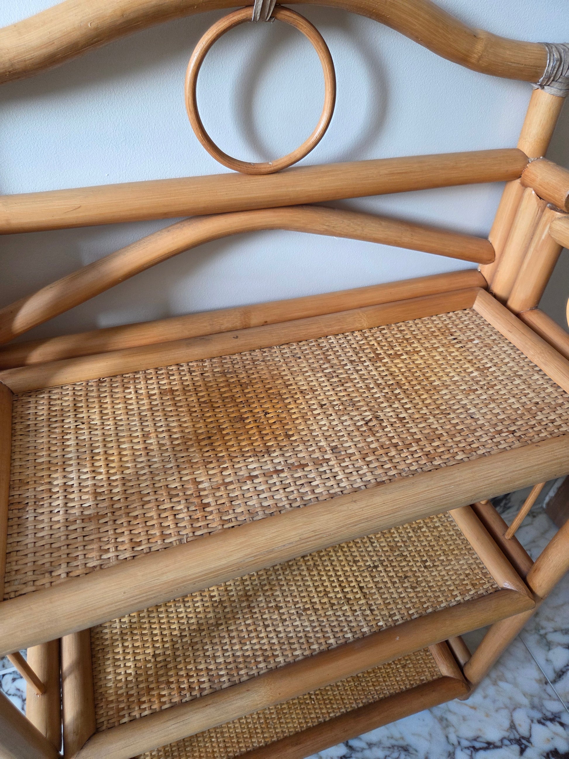 This vintage folding bamboo unit with three shelves dates to the 1960s and would be perfect in a bathroom. Great for lovers of boho vibes and vintage bamboo furniture.