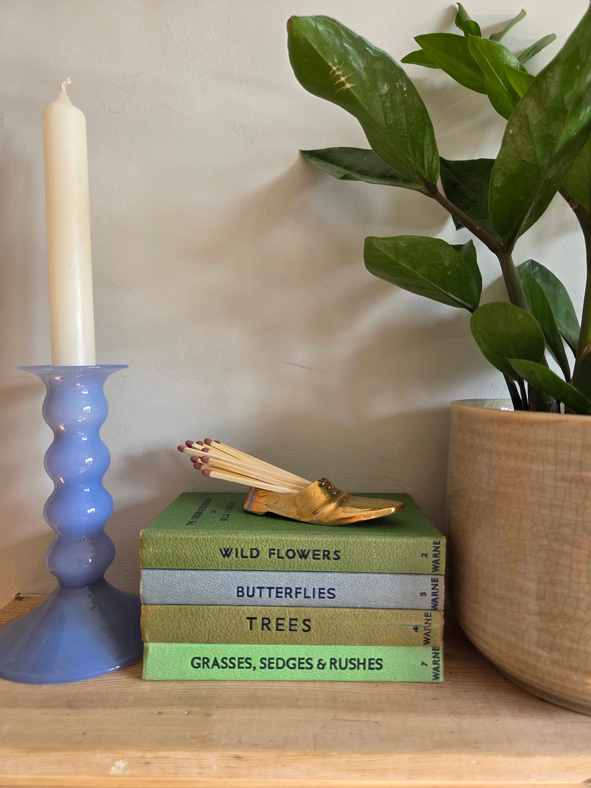 This vintage Indian brass shoe has the sweet detail of added laces. I think it’s a unique conversation piece for a bookshelf. Perfect for vintage brass curios and lovers of world decor. It works wonderfully as a match holder and will be provided with a match strike sticker for the base.