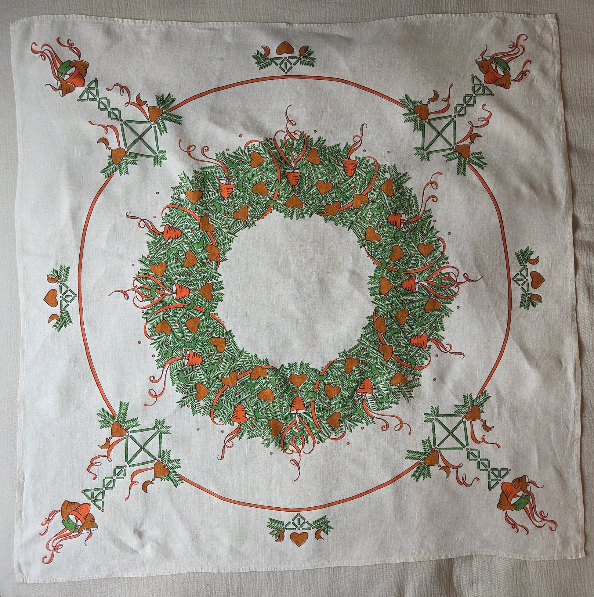 Vintage Swedish Christmas Tablecloth - Wreath and Hearts