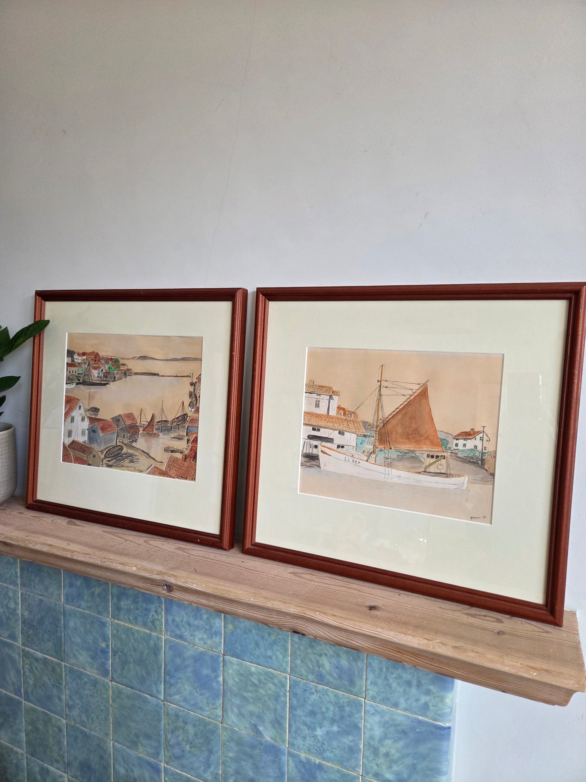 This vintage Swedish watercolour by Helmer, painted in 1950, is a stunning example of a Swedish coastal watercolour painting. It includes all the classic swedish scenery - sailing boats, seaside village and the beautiful swedish coastline of granite archipeligo and endless sea. This piece is perfect for a gallery wall or hung with it's partner painting which was painted by the same artist a year later and is available here.