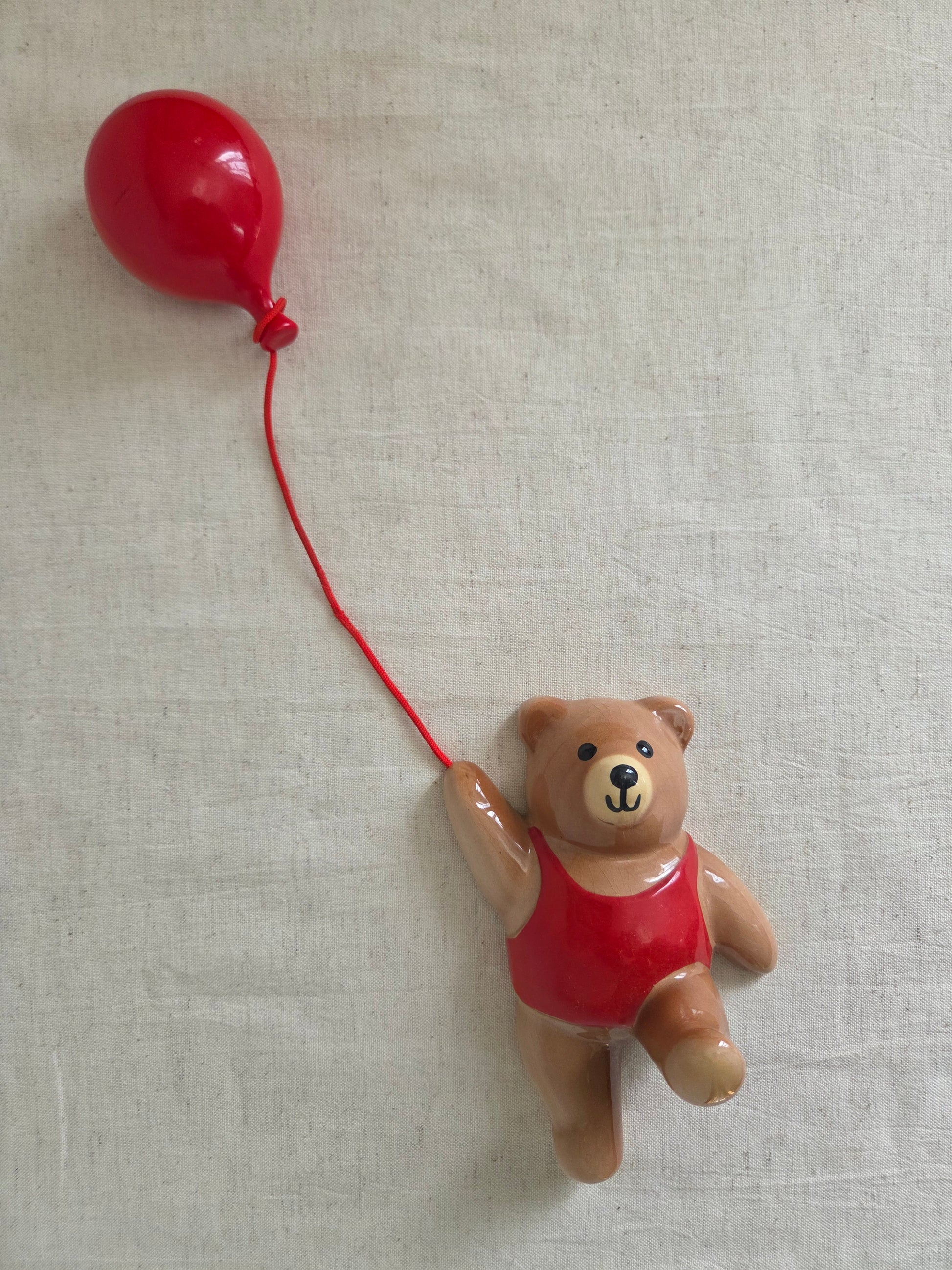 A vintage wall bear with red balloon, hand-painted and full of character. I think this adds a sweet, nostalgic vibe to a nursery. I love styling these in pairs for a whimsical wall display.
